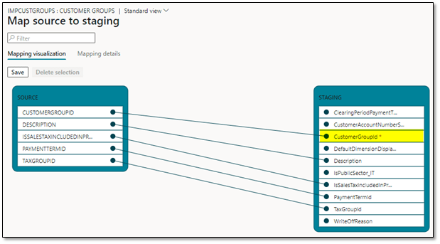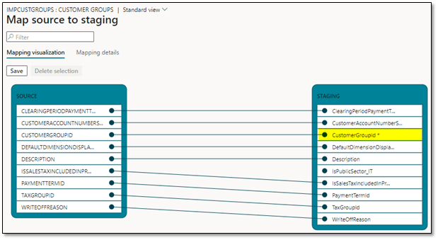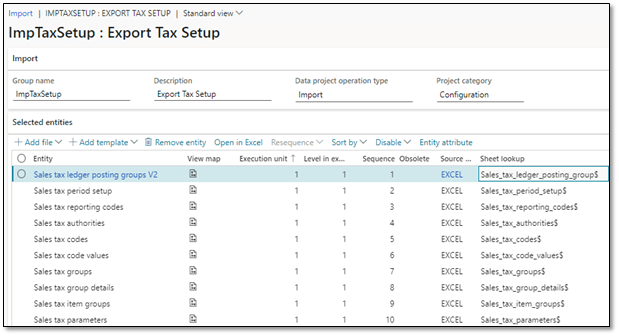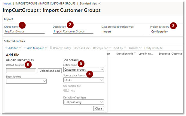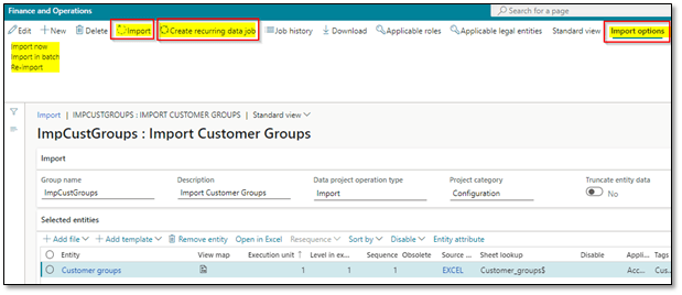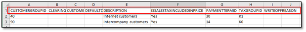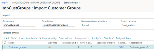 For example, if you want to import customer groups via Excel, source file should contain correct values for column heading, which can mapped to staging table. To guarantee that the source file has correct mapping, you can export the entity for the company, download it and update it with values that you want to import in the company.