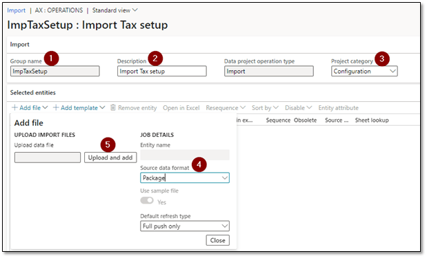 On the data import job click on “Add file”, choose source file type, write down the entity name and then upload the file.