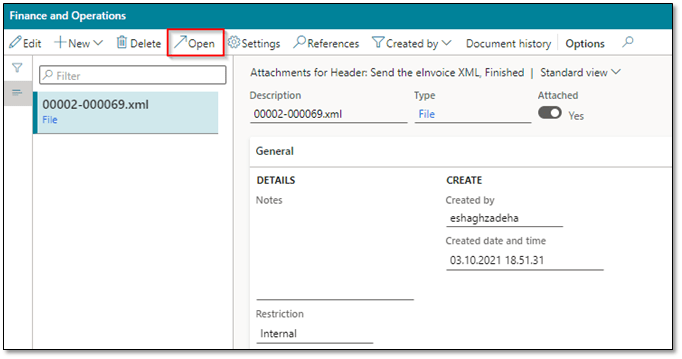 You can find the generated e-invoice file on Organization administration > Electronic reporting > Electronic reporting jobs with following information: