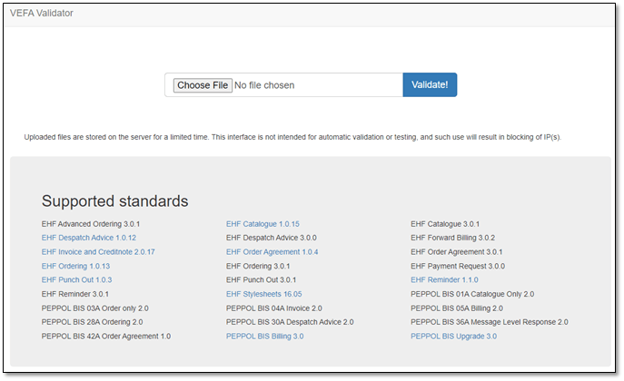 Once the file has been downloaded on your PC, you can validate the file on VEFA validator (VEFA Validator (anskaffelser.dev)) to check if the generated file is in regards with PEPPOL BIS Billing 3.0/EHF Billing 3.0. This validation tool is created and supported by DFØ (Direktoratet for Forvaltning og Økonomistying)