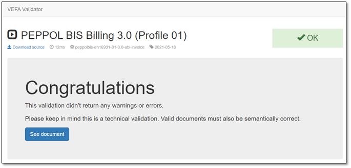 Then you can choose the invoice file and click on validate. You will get the following message when the invoice validated without any error or warning.