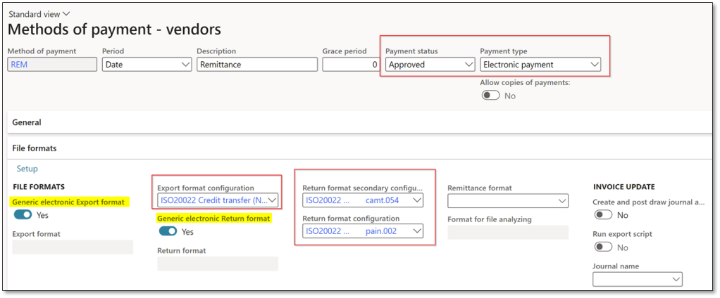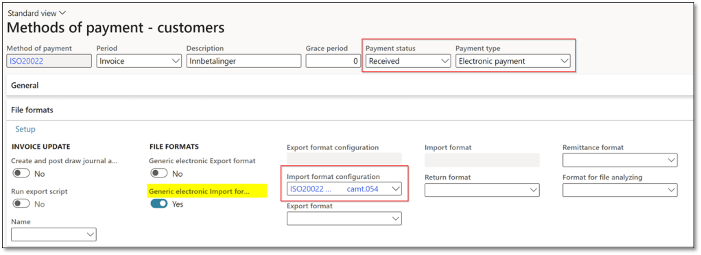 - Navigate to Account payable > Payment setup > Methods of payment and set following values for provided fields: