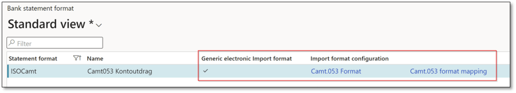 - Navigate to Cash and bank management > Setup > Bank statement format and add “Camt.053” as new statement format.