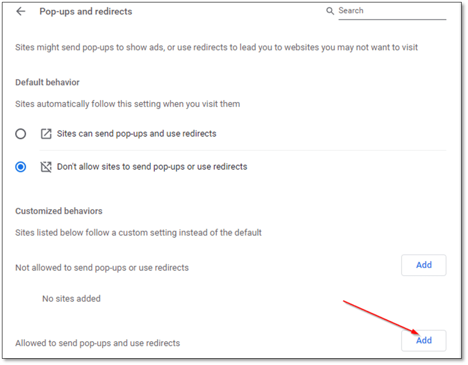 - Add the environment URL to your browser allowed “Pop-ups and redirects”. For Chrome, you can find this setup on Setting > Privacy and security > Site setting > Content > Additional permissions > Pop-ups and redirects