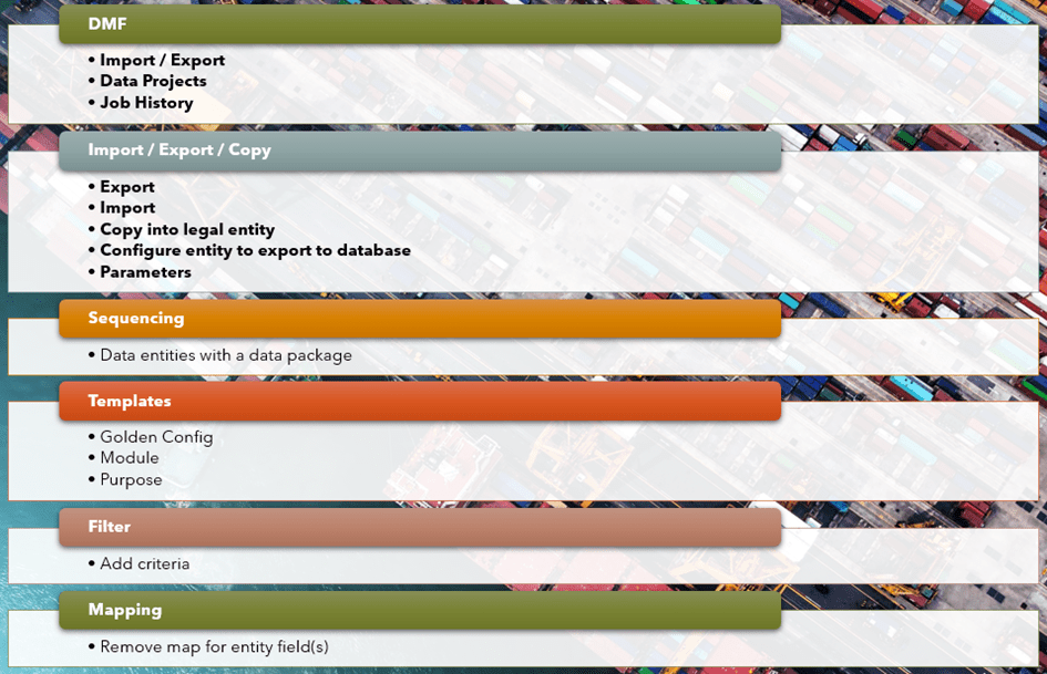 Data Management Framework (DMF) is a standard tool in D365FO that can be used import, export, and copy data (setup, configurations, references, master, and document data) into legal entities. This tool is purposefully designed to assist data migration in D365FO.