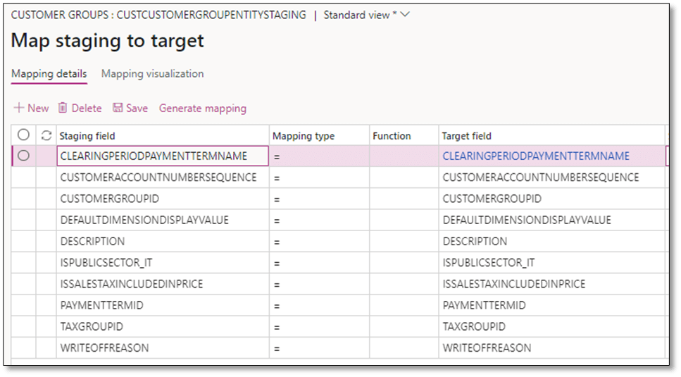 Once the data entity list is refreshed, you will get the list of entities on “Data Entities”. Each entity (i.e., entity type: Entity) has a target mapping that shows the mapping of staging table to target. It means that once you want to import data in D365FO via DMF you need to have a source file with heading that is like target fields. If the source file have correct data in regards to type of fields and type of data that each field must have (plus without any duplicate), data will be imported on staging table, then it will be checked if the data that is on each field can be imported into target table (e.g. if the value is found on related table). Therefore, you have possibility to overwrite (i.e., Update) and insert record into the target table.