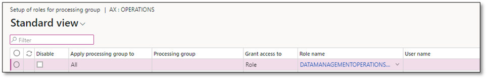 Once you open the setup, you will find following fields to configure processing group permissions. You can control which users and roles have access to specific data entities within DMF, and what level of access they have. This helps to ensure that sensitive data is only accessible to authorized users, while also streamlining data management tasks for those who need to work with the data.