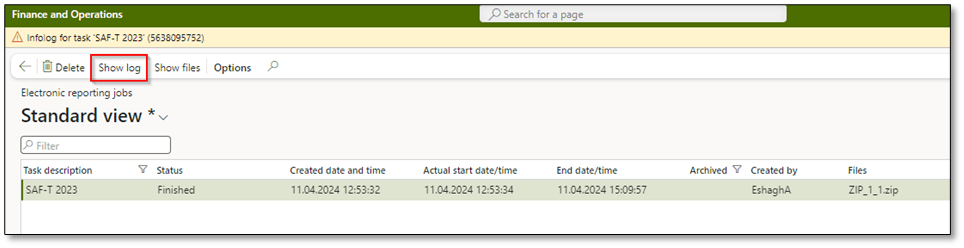 Once you have generated a SAF-T file, you can review electronic reporting jobs by navigating to Organizations administration > Electronic reporting > Electronic reporting jobs and clicking on “Show log” to get a better overview of fields that need to be reviewed and potentially updated to generate a valid file for the tax administration.