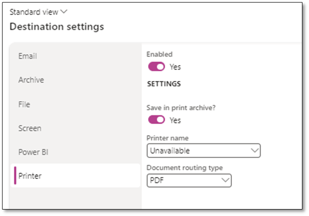 For printing documents, the Document Routing Agent must be installed and configured. After setup, network printers need to be registered in D365FO.