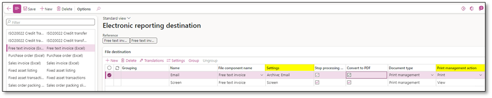 D365FO offers multiple options for managing CBDs, including PDF viewing, emailing, archiving, and SharePoint integration, all configured under Organization administration > Electronic reporting > Electronic reporting destinations. Both standard Microsoft CBD and custom documents can be utilized within this framework. Additionally, documents can be converted from Excel or Word to PDF, which is particularly useful for invoices and similar documents.