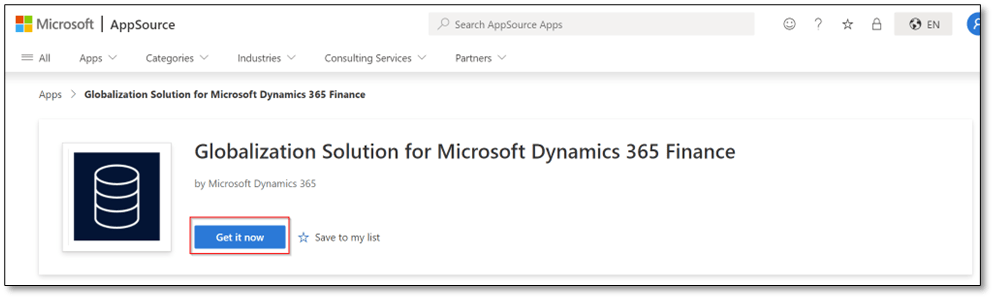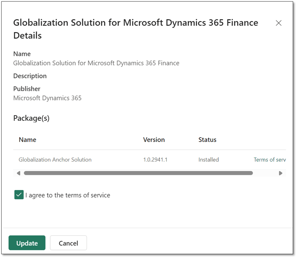 - Search for Globalization Solution for Microsoft Dynamics 365 Finance, and if an update is available, click Update to install it.