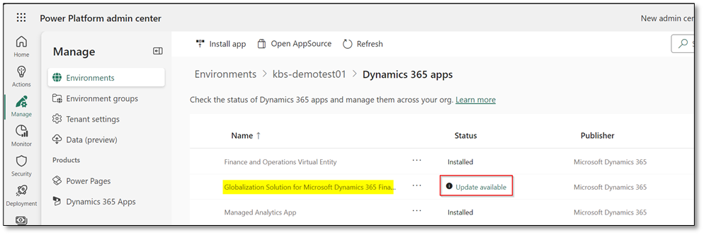 - Search for Globalization Solution for Microsoft Dynamics 365 Finance, and if an update is available, click Update to install it.