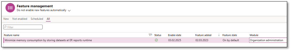 In the latest quality update for 10.0.42 (10.0.2095.93), a fix has been introduced that allows users to activate the feature “Minimize memory consumption by storing datasets at ER reports runtime” without encountering errors.