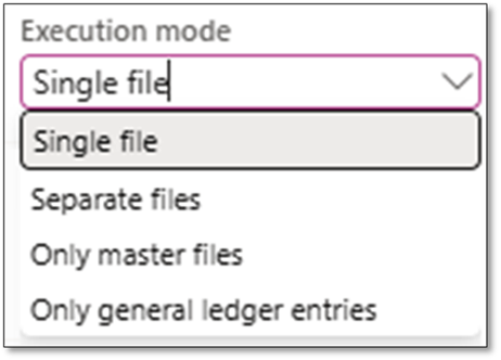 🧠 Pro tip: SAF-T generation performance is highly dependent on the combination master data (Financial dimensions, Main accounts, customers, vendors and tax codes and transactions in the selected period. Optimize ranges where possible and take advantage of Execution mode.