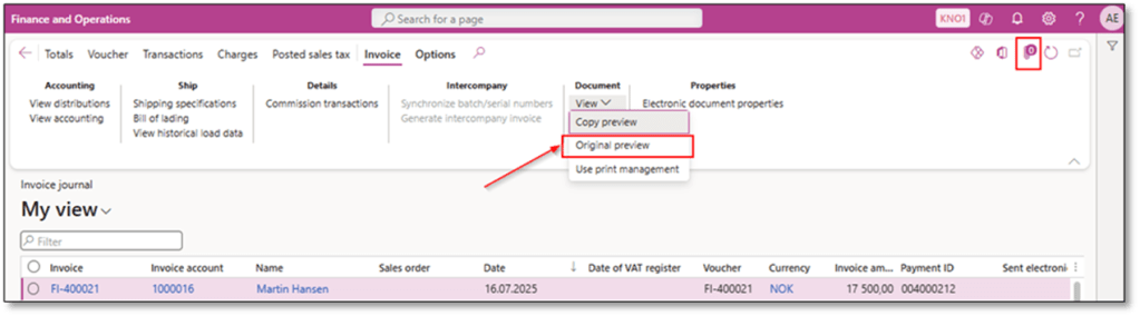 - Select the journal line and click View > Original view (or open the document menu depending on form).