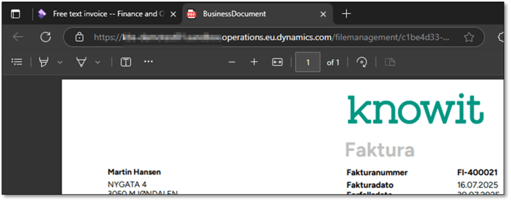 - At invoice posting, if Print invoice = Yes, D365FO renders the printable document to PDF (SSRS or CBD/EBD) and attaches it to the posted journal (e.g., CustInvoiceJour).