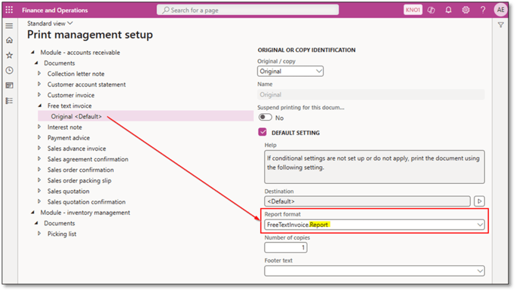 - You configure Print management for the source document (Sales invoice, Free text invoice, Project invoice, Collection letter, etc.).