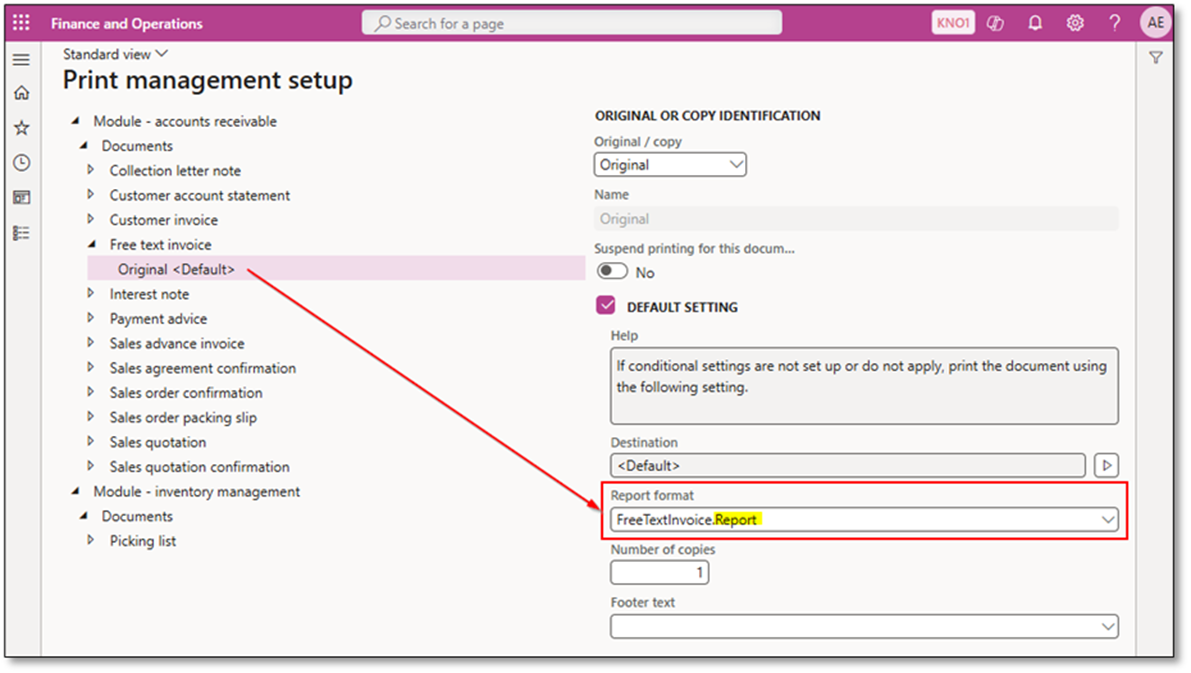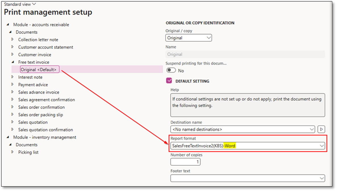 - You configure Print management for the source document (Sales invoice, Free text invoice, Project invoice, Collection letter, etc.).