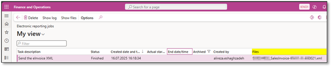 - Run the ER e‑invoice format (immediate or batch) that reads the journal record and, because the customer is flagged for eInvoice attachment, embeds the PDF as base64 in the XML.