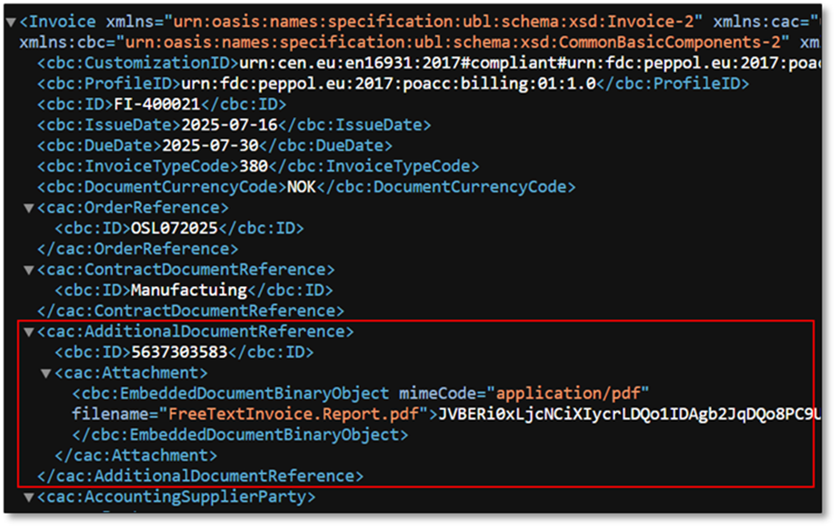 <cbc:EmbeddedDocumentBinaryObject mimeCode="application/pdf" filename="FreeTextInvoice.Report.pdf">JVBERi0... (base64 content trimmed)